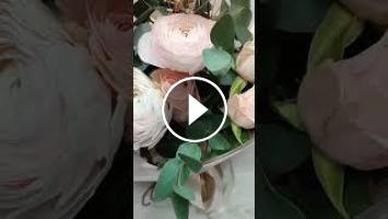Нежный букет из ранункулюсов и роз в обрамлении эвкалипта.