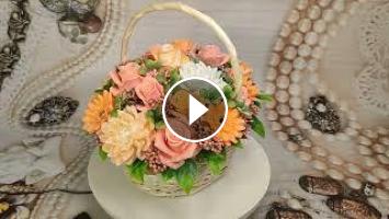 Мыльный букет в корзинке из роз, гербер и георгин.