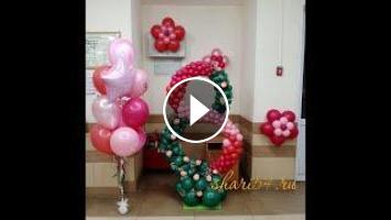 Композиция из воздушных и гелиевых шаров: цифра 8 на каркасе из воздушных шаров с живыми розами и фонтан (розовая звезда с индивидуальной надписью, шары с принтами, агаты).